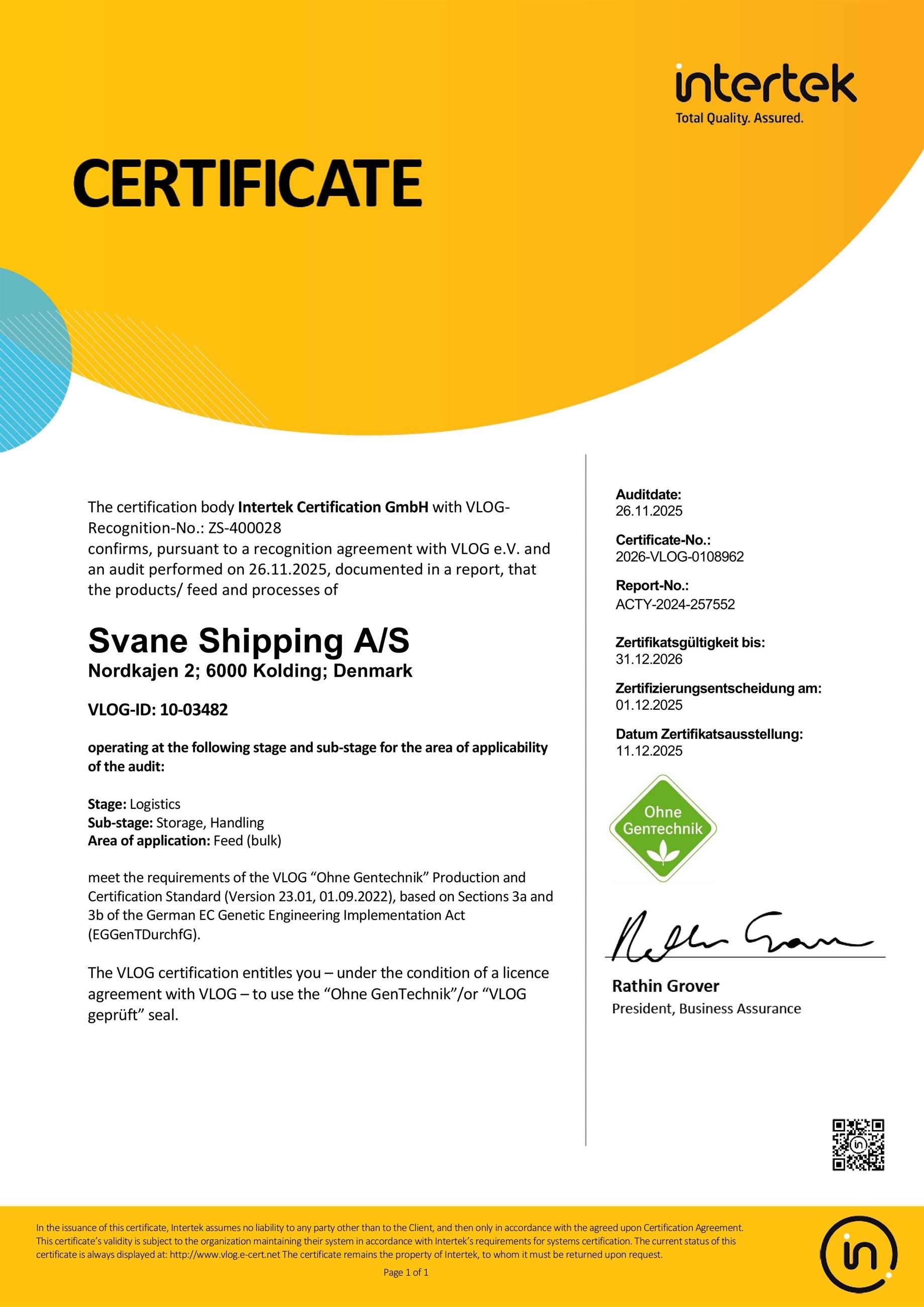 We hold GMP+ certificate for trade, storage & transhipment of feed materials.